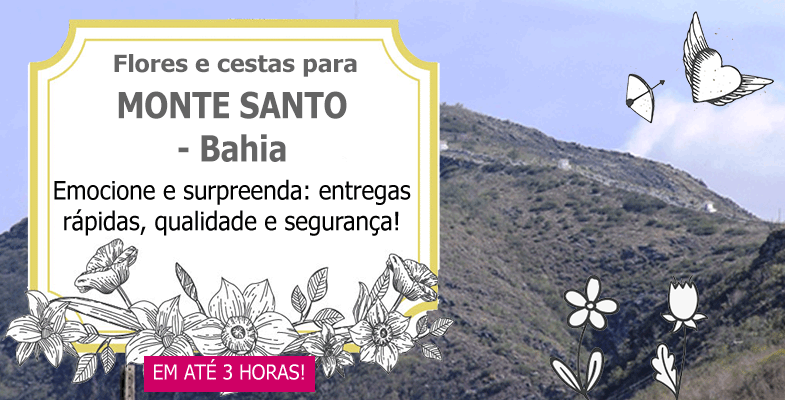 Efetuamos entregas de flores e cestas em Monte Santo até no mesmo dia, através das melhores floriculturas locais. Conforme o horário da compra, podemos fazer a entrega das fores em Monte Santo em até 3 horas. Monte Santo é um município brasileiro do estado da Bahia. Em outubro de 1775, Capuchinho Frei Apolônio de Todi que se encontrava na aldeia indígena de Massacará (hoje situada no Município de Euclides da Cunha), foi convidado pelo fazendeiro Francisco da Costa Torres, a realizar uma missão de penitência na Fazenda Lagoa da Onça, de sua propriedade, ali chegando deparou com uma grande seca e devido à escassez de água no local, não realizou a missão, decidiu então, seguir para o logradouro de gado denominado "Piquaraçá" onde existia um olho d’água em abundância conhecido atualmente como "Fonte da Mangueira", localizado no pé da serra.