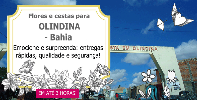 Efetuamos entregas de flores e cestas em Olindina até no mesmo dia, através das melhores floriculturas locais. Conforme o horário da compra, podemos fazer a entrega das fores em Olindina em até 3 horas. Olindina é um município brasileiro do estado da Bahia. O primeiro nome da cidade foi Mucambo, depois Nova Olinda e seguido pelo atual Olindina. A história e surgimento do Município de Olindina iniciam-se nas três décadas finais do século XIX e está diretamente relacionada à Guerra do Paraguai, quando por força de hábito da época o Dr. Pedro Ribeiro de Araújo, médico-chefe do hospital para feridos da guerra, foi agraciado com as terras da atual Olindina, onde tomou posse batizando o lugar de Fazenda Mocambo (em razão do nome originalmente atribuído ao local) e a Guerra de Canudos.