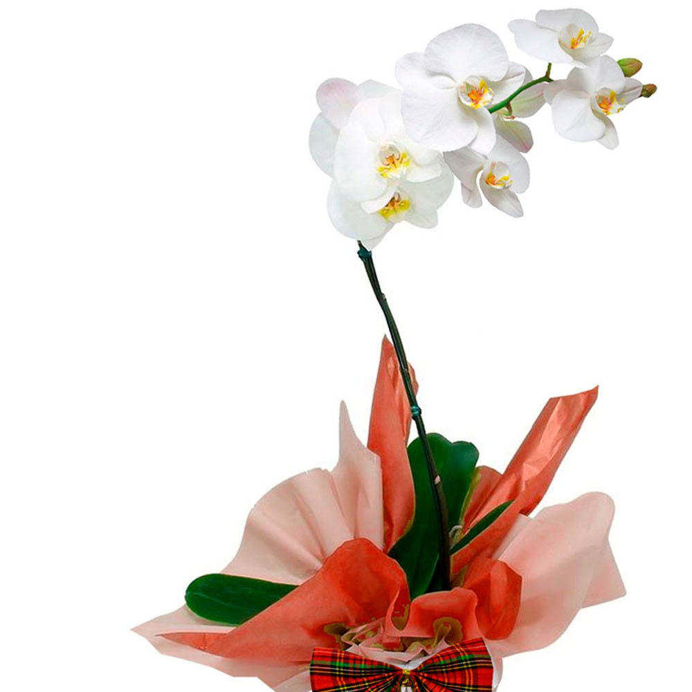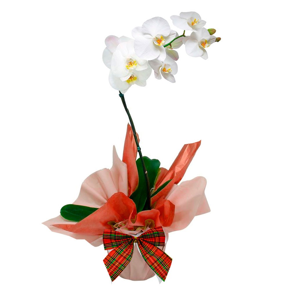 Uma linda Orquídea Phalaeonopsis branca, de qualidade especial, em um cachepot, embalada para presente com tons de vermelho e verde e inspiração natalina. Um presente especial para todos os momentos.
