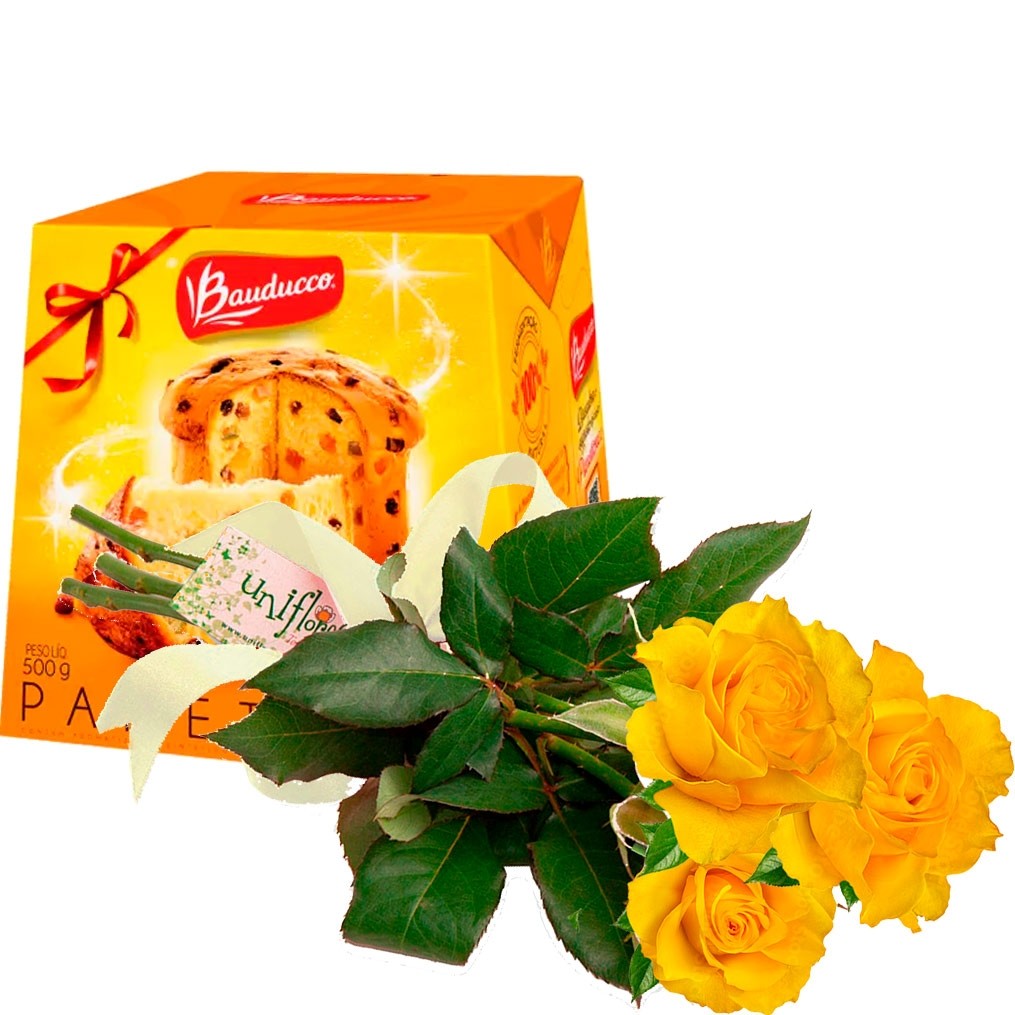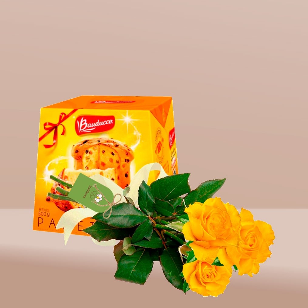 Delicado ramalhete com 3 lindas rosas nacionais de primeira qualidade e folhagens, embaladas delicadamente com um laço para presentear. Ramalhete com aproximadamente 30 cm de altura. Acompanha um Panettone Bauducco 500g.