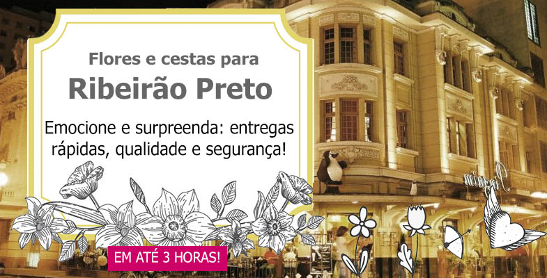 Efetuamos entregas de flores e cestas em Ribeirão Preto até no mesmo dia, através das melhores floriculturas locais. Conforme o horário da compra, podemos fazer a entrega das fores em Ribeirão Preto em até 3 horas. Ribeirão Preto é um município brasileiro no interior do estado de São Paulo, Região Sudeste do país. Entregamos as mais belas flores e cestas em todos os bairros de Ribeirão Preto, como Campos Elíseos, Vila Gertrudes, José Sampaio, Parque das Figueiras, Presidente Dutra, Quintino, Salgado Filho, Centro, Vila Mariana, Alto do Ipiranga e muitos outros. Não importa a distância, emocione e surpreenda enviando as mais lindas flores e cestas para pessoas queridas com nossa floricultura em Ribeirão Preto e região!
