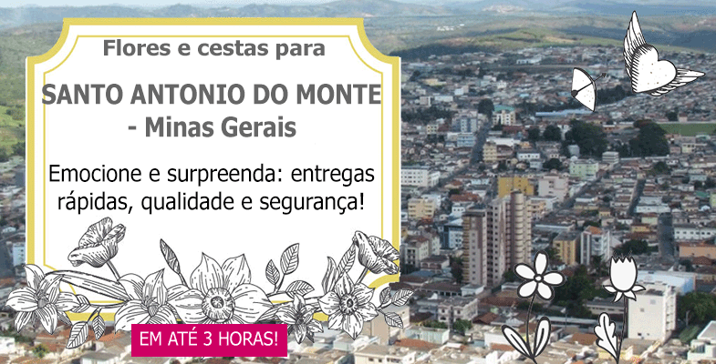Efetuamos entregas de flores e cestas em Santo Antônio do Monteaté no mesmo dia, através das melhores floriculturas locais. Conforme o horário da compra, podemos fazer a entrega das fores em Santo Antônio do Monteem até 3 horas. Santo Antônio do Monte é um município brasileiro do estado de Minas Gerais.