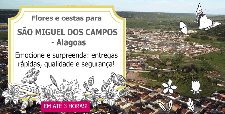 Efetuamos entregas de flores e cestas em São Miguel dos Campos até no mesmo dia, através das melhores floriculturas locais. Conforme o horário da compra, podemos fazer a entrega das fores em São Miguel dos Campos em até 3 horas. São Miguel dos Campos é um município brasileiro do estado de Alagoas.