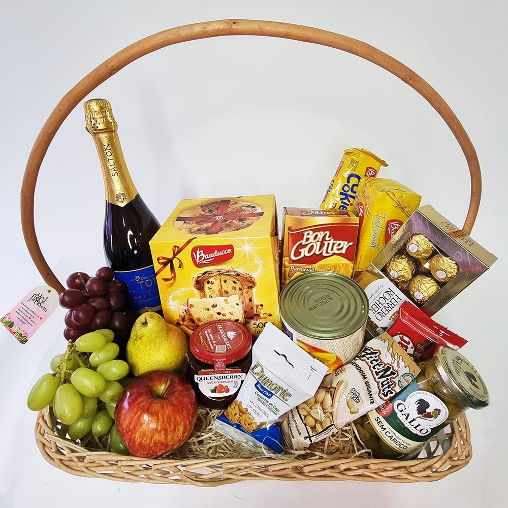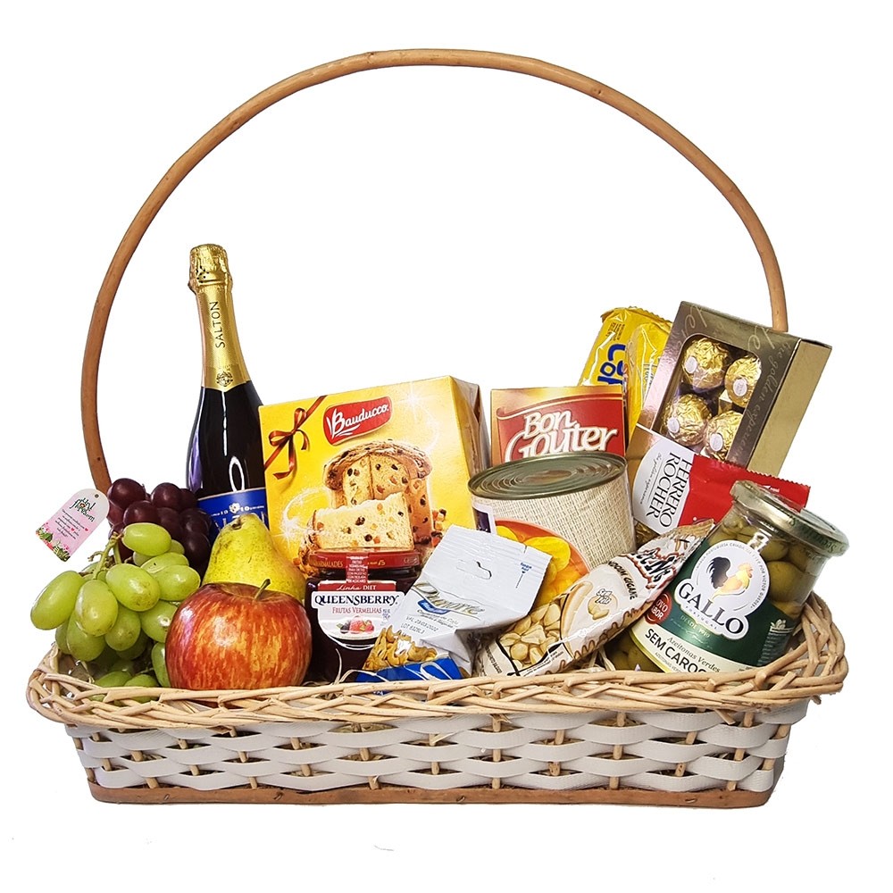 Esta bela cesta para presente é composta por ítens como: Panettone Bauducco 500g, Vinho espumante Salton Brut ou similar, Biscoitos Bon Gouter 100g, Chocolates Kit Kat, Biscoitos Cookies, Geléia Queensberry Frutas Vermelhas 280g, Lata de Pêssegos em conserva, Azeitonas em conserva e dois tipos de castanhas e amendoins para petisco, 4 tipos de frutas selecionadas, como cachos de Uvas, pêras e maçãs e uma caixa com 8 bombons Ferrero Rocher. Itens sujeitos a substituição por produto equivalente conforme a cidade da entrega, sempre preservando o bom gosto e qualidade para que seu presente seja entregue em um momento muito especial!