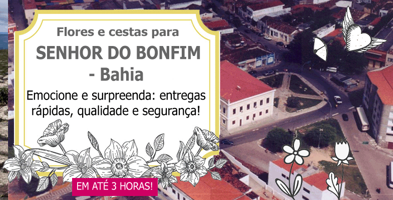 Efetuamos entregas de flores e cestas em Senhor do Bonfim até no mesmo dia, através das melhores floriculturas locais. Conforme o horário da compra, podemos fazer a entrega das fores em Senhor do Bonfim em até 3 horas. Senhor do Bonfim é um município brasileiro localizado no centro norte da Bahia.A história da formação de Senhor do Bonfim está diretamente relacionada à busca de ouro e pedras preciosas e à introdução da criação de gado no sertão baiano. Em fins do século XVI, portugueses pertencentes à Casa da Torre, organizavam expedições com destino ao rio São Francisco e às minas de ouro de Jacobina, iniciando a ocupação do interior da província e a formação de vias de comunicação com o litoral.