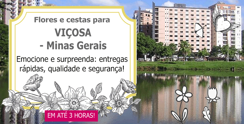 Efetuamos entregas de flores e cestas em Viçosa até no mesmo dia, através das melhores floriculturas locais. Conforme o horário da compra, podemos fazer a entrega das fores em Viçosa em até 3 horas. Viçosa é um município brasileiro do estado de Minas Gerais. Sua população em julho de 2016 foi estimada em 77 863 habitantes.Trata-se de uma cidade essencialmente vocacionada para a educação, com destaque para a Universidade Federal de Viçosa, fundada em 1926 pelo então presidente da República Arthur da Silva Bernardes, nascido em Viçosa. Conta ainda com outras instituições de ensino superior privadas acentuando ainda mais o caráter educacional da cidade. É uma cidade que atrai várias pessoas do Brasil e de outros países devido a eventos científico-acadêmicos que se realizam em torno da universidade, somando aproximadamente 500 eventos anuais. Sua população é composta na sua maioria por jovens, o que confere uma dinâmica à cidade, além do grande número de festas que se realizam durante a semana.
