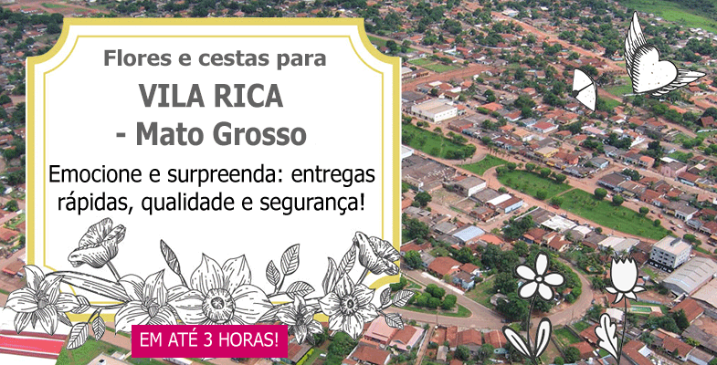 Efetuamos entregas de flores e cestas em Vila Ricaaté no mesmo dia, através das melhores floriculturas locais. Conforme o horário da compra, podemos fazer a entrega das fores em Vila Ricaem até 3 horas. Vila Rica é um município brasileiro do estado de Mato Grosso.Vila Rica localiza-se ao nordeste do Mato Grosso, na triplice fronteira com os estados do Pará e do Tocantins, A cidade foi fundada em 1978 pelo Sr. Rubens Rezende Peres e pelo Sr. Alair Álvares Fernandes, que vieram para a região com a Colonizadora Vila Rica. Os fundadores, como proprietários de uma grande área de terras, resolveram edificar no local vários assentamentos de pequenos colonos, assim sendo, dividiu-se a terra em pequenas propriedades e as colocou à venda juntamente com o INCRA e Banco do Brasil, em sistema de colonização, e em decorrência de qualidade e fertilidade do solo, o negócio teve grande aceitação. A cidade começou então a ser erguida nas terras cedidas pelo Sr. Alair, em sua fazenda Porangaba.
